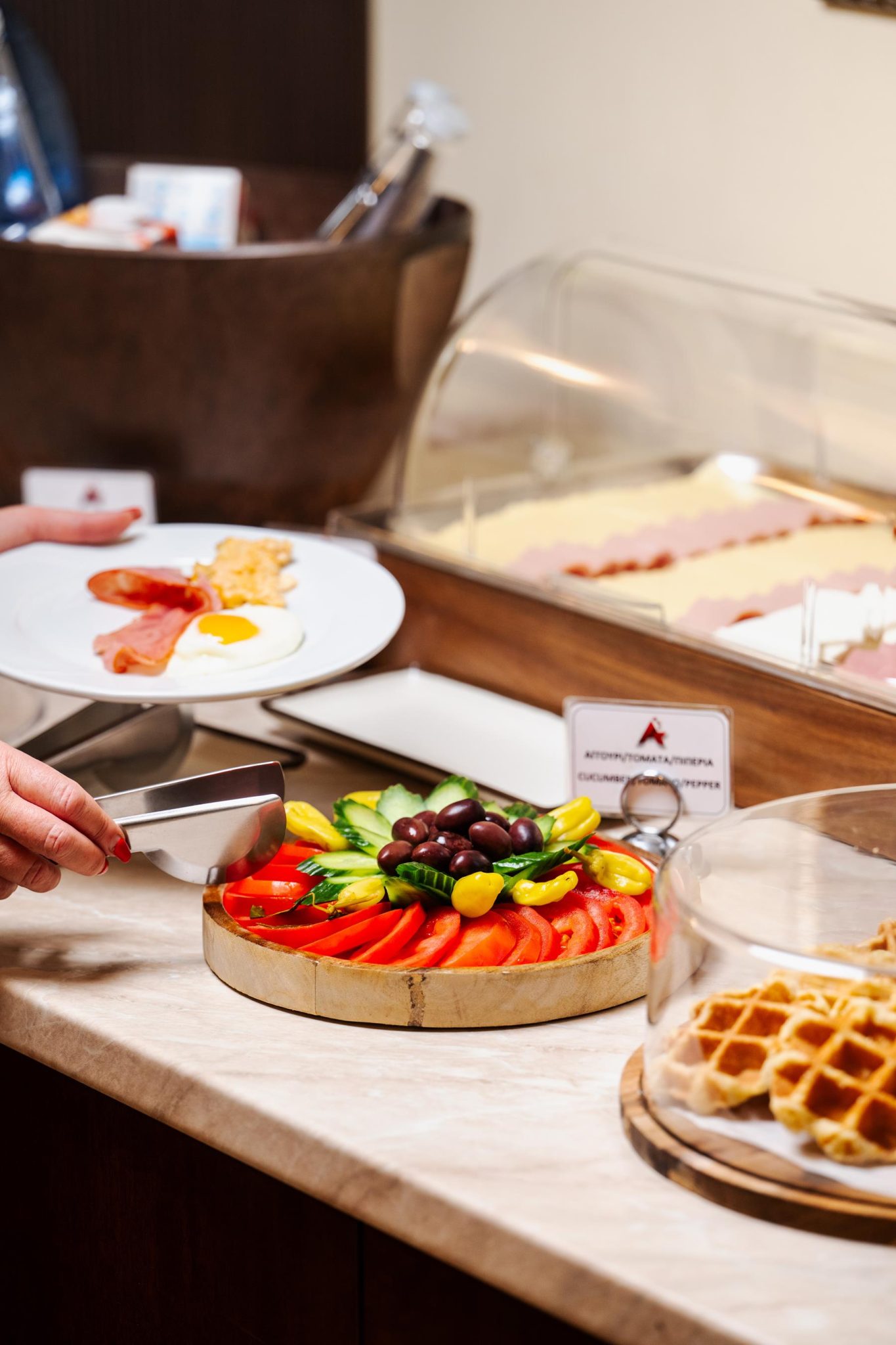 Καθημερινά από 07:00 έως 10:30, απολαύστε πρωινό ξενοδοχείου κοντά στο αεροδρόμιο Θεσσαλονίκης, με επιλεγμένες γλυκές και αλμυρές επιλογές, φρεσκοψημένα αρτοσκευάσματα, φρούτα εποχής, αυγά, δημητριακά και εκλεκτά ροφήματα. Κάθε λεπτομέρεια έχει σχεδιαστεί για να προσφέρει μια ήρεμη και απολαυστική εμπειρία, ιδανική για επαγγελματικά ταξίδια αλλά και για στιγμές χαλάρωσης.